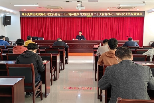 12月8日上午,市城投集團(tuán)黨委書(shū)記、董事長(zhǎng)周永貴到掛點(diǎn)聯(lián)系的下屬濱海公司宣講黨的二十大精神,并就學(xué)習(xí)貫徹黨的二十大精神深化三項(xiàng)制度改革開(kāi)展專題調(diào)研。濱海公司全體黨員干部職工參加宣講會(huì)及專題調(diào)研。周永貴結(jié)...
